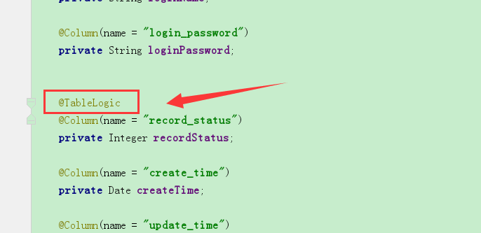 我框起来的一段代码,是为了保证你在生成实体类的时候,这个record_status字段有着特定的一个注解:@TableLogic