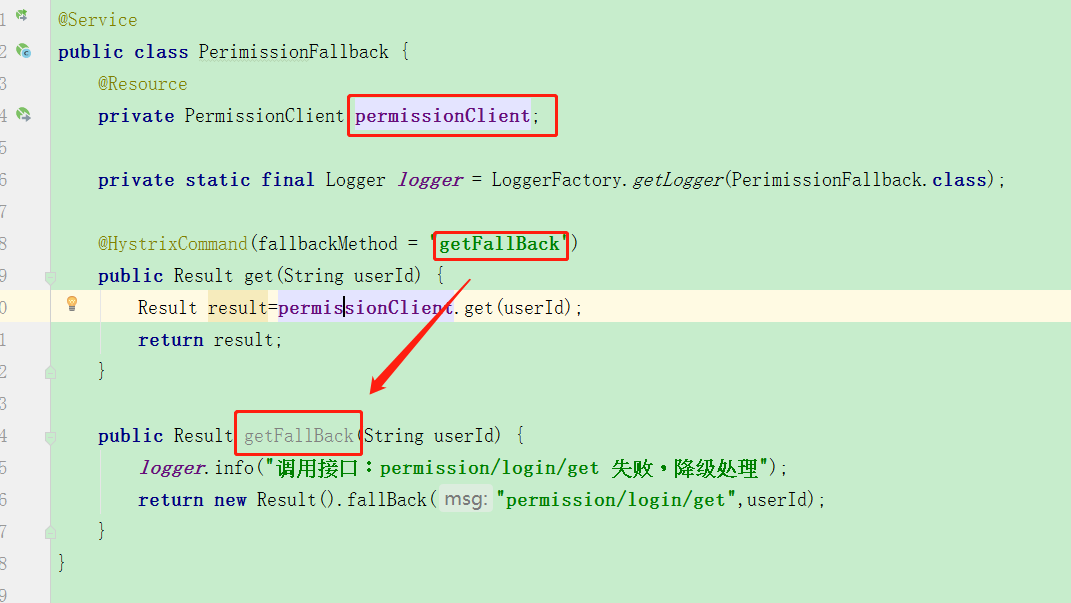 代码里面的注解:@HystrixCommand(fallbackMethod = “getFallBack”),这个就是引入了Hystrix的方法降级,降级的方法就是getFallBack这个方法,图片中我用红色箭头标出来了,很容易理解。