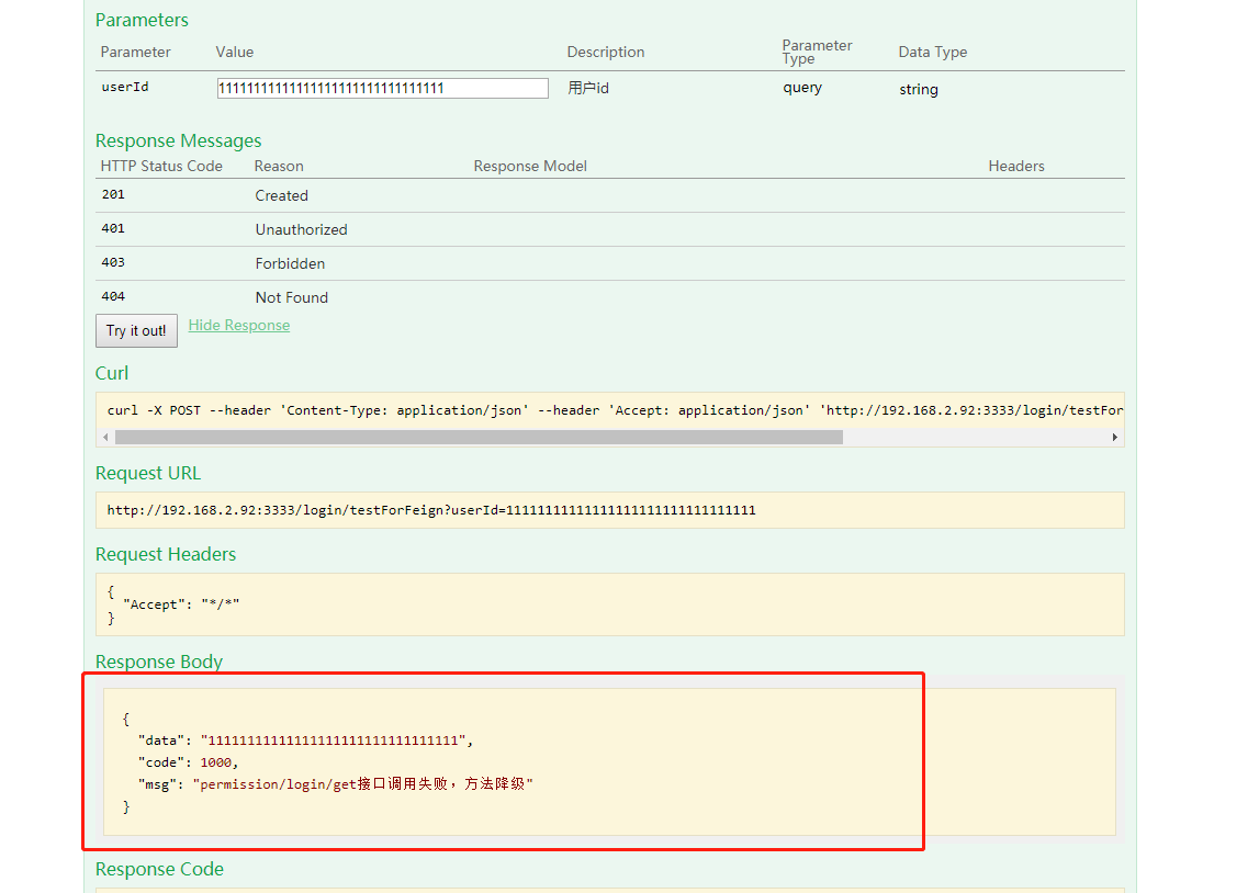 然后再在swagger上调用接口,我们发现,当打上断点到一点的时间点(其实就是我们设置的Hystrix的熔断时间,仔细看一下我们的配置文件,application.properties),然后再去掉断点,让程序运行,那么调用接口就会失败,返回的内容也是我们自己定义的返回内容: