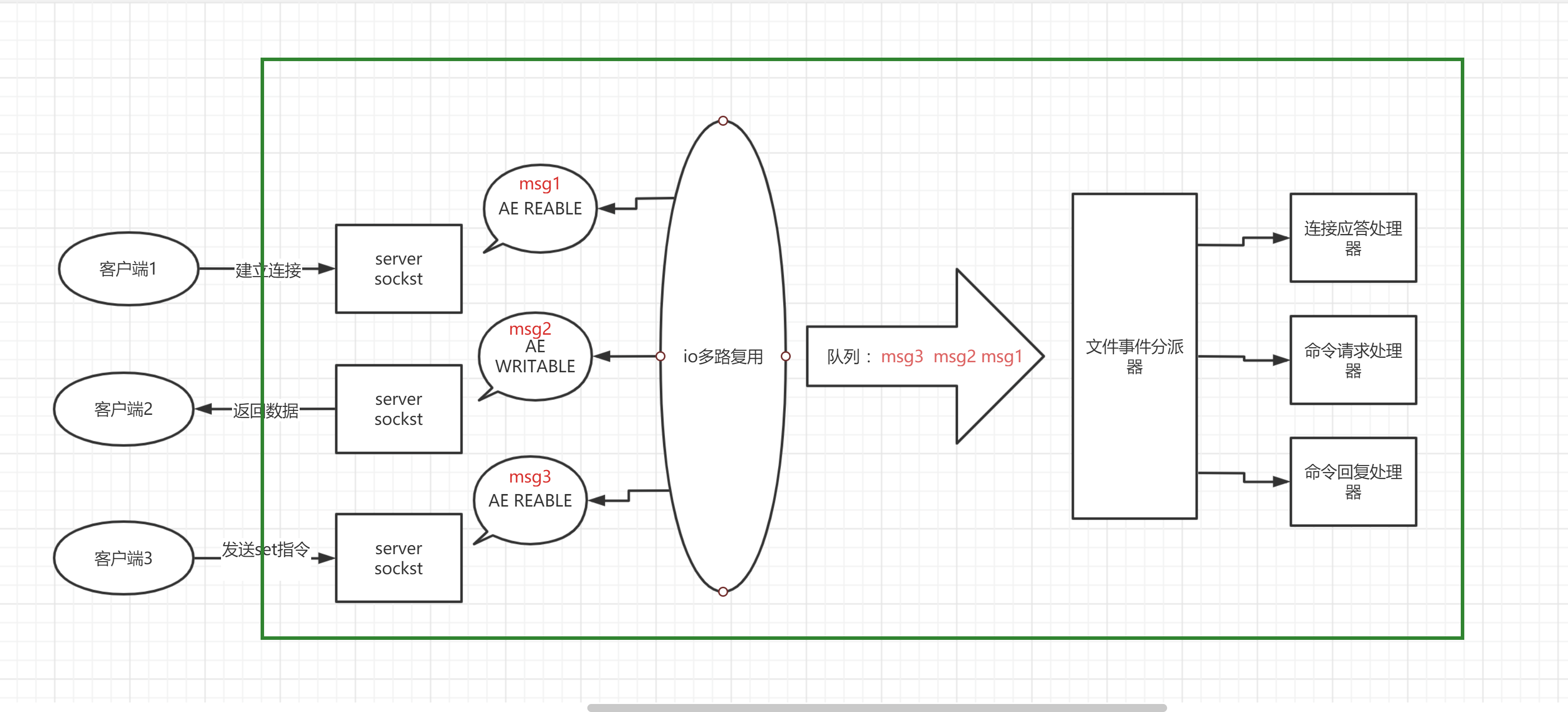 事实上,多个socket可能会并发产生不同的操作,每个操作对应不同的文件事件,但是io多路复用程序会监听多个socket,会将产生事件的socket放入到队列中排队,以有序(sequentially)、同步(synchronously)、每次一个套接字的方式向文件事件分派器传送套接字,事件分派器根据socket的时间类型交给对用的时间处理器进行处理。