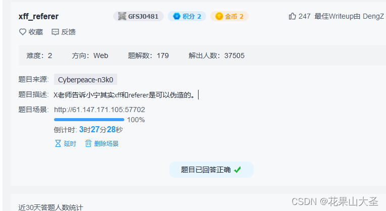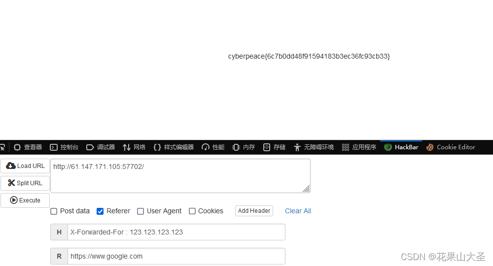 于是自然想到了hackbar,这个东东,之前做请求方式的题用过这个,琢磨了一下,发现操作性成立。进行操作,完美拿到flag。。PS:没有的请求头可以用自定义添加的方式加上去。