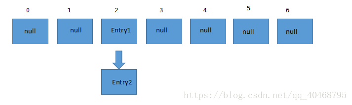 当有另外的键值对的hashcode值与原本hashMap中键值对的hashcode值重复时,就会产生如图的链表,新的entry键值对会放置在链表的头节点上。在日常开发中为了保证hashMap的快速存取,应当避免产生链表,当产生链表时,调用get方法效率会变低。
