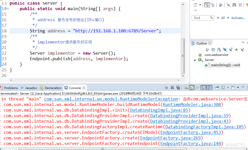 Endpoint.publish(address, implementor);但是此时运行的话会报运行时异常,因为服务不包含任何有效的 。