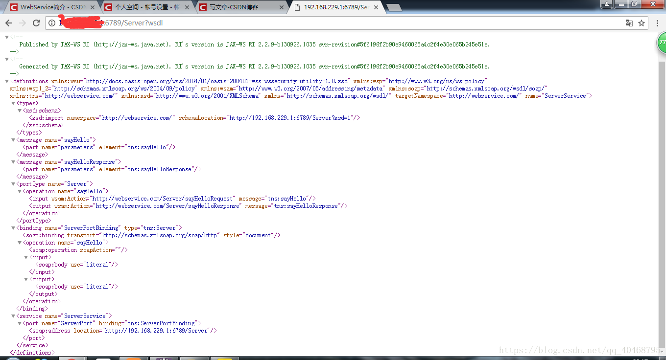 }定义一个简单的方法,然后运行。打开浏览器输入address后+?wsdl,可以看到自己发布服务的wsdl