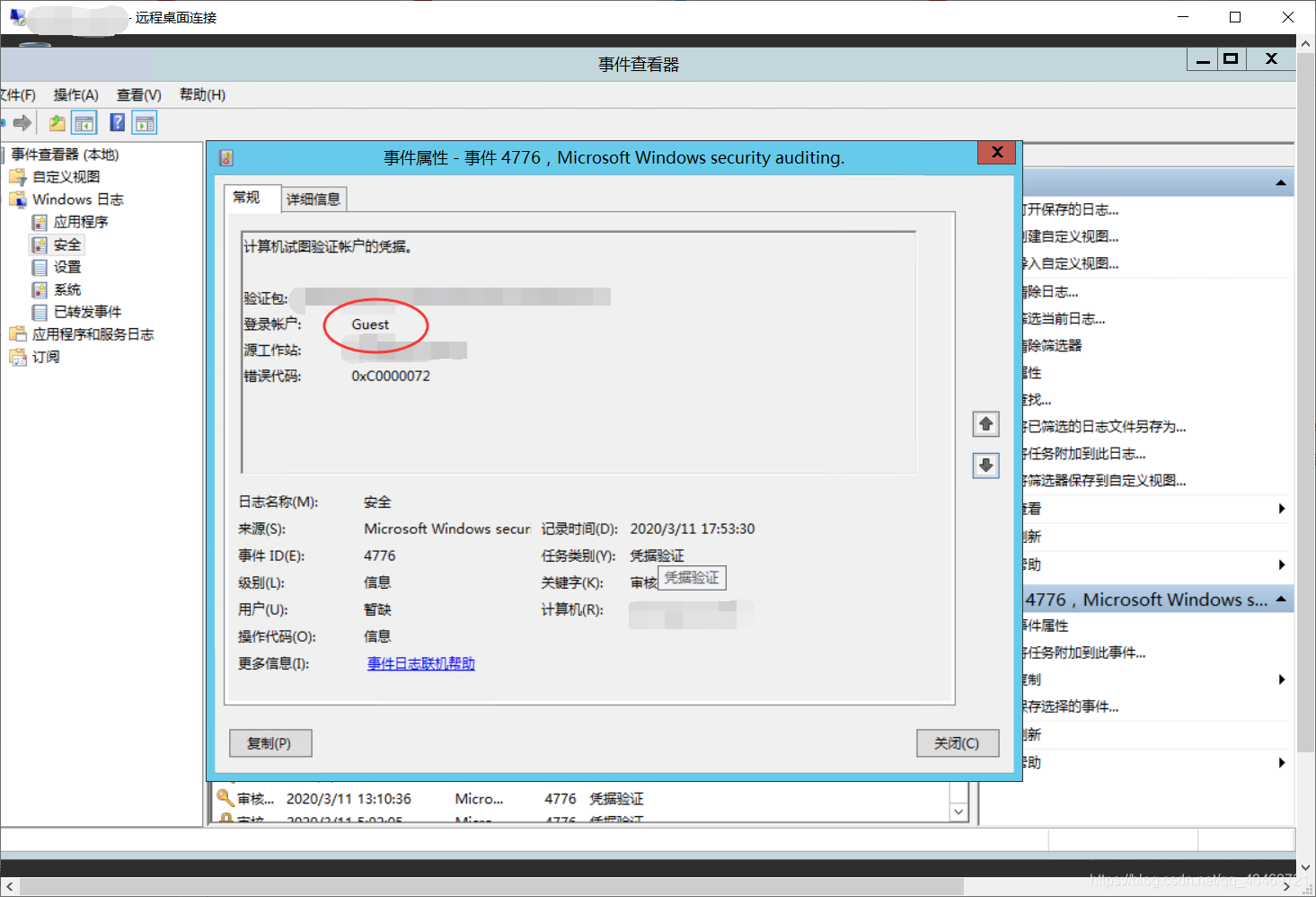 点击右侧筛选,筛选事件ID为4776的所有事件,即为所有远程登录日志。