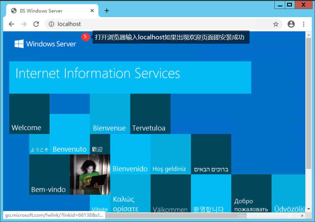 5.检测是否安装成功,在浏览器地址栏输入localhost,或者在本地浏览器地址栏输入你的服务器IP,如果出现欢迎界面则安装成功IIS服务。接下来就可以部署你的个人网站了。