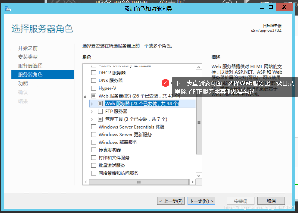 2.点击“下一步”直到服务器角色,找到Web服务器(IIS)点击选中,不要勾选FTP服务器。