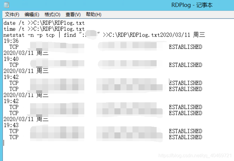netstat -n -p tcp | find ":3389" >>C:\RDPlog.txt