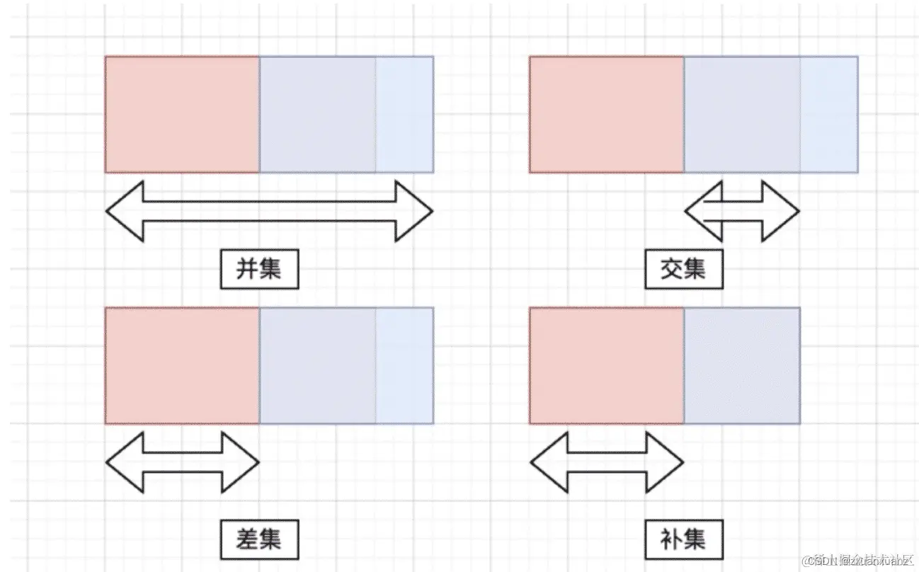 - 补集,补集是差集的特殊情况,此时集合 B 为集合 A 的子集,在这种情况下 A 相对于 B 的差集 + B = 完整的集合 A。