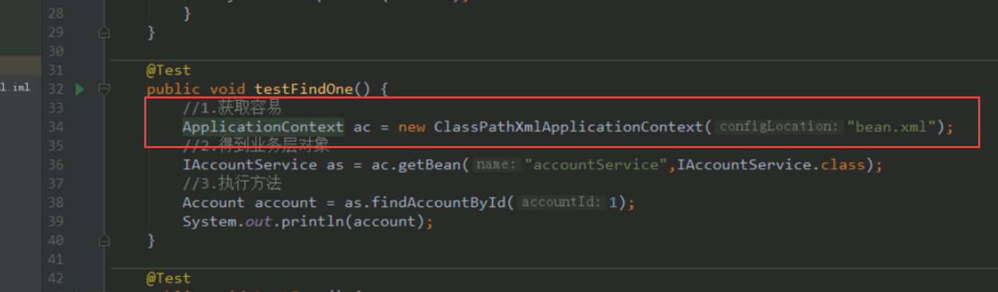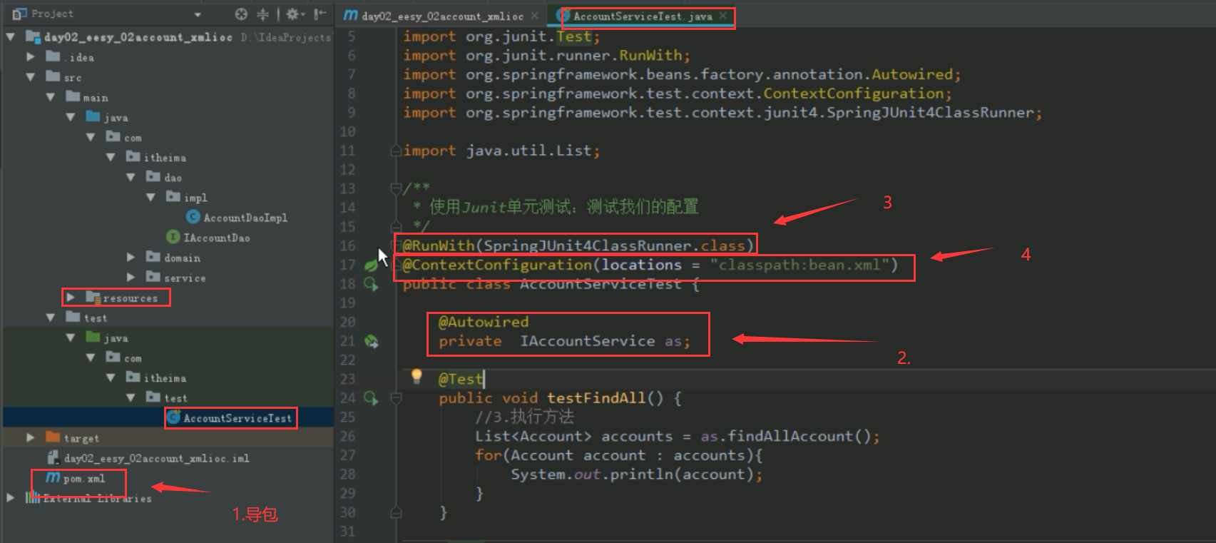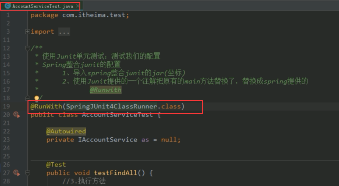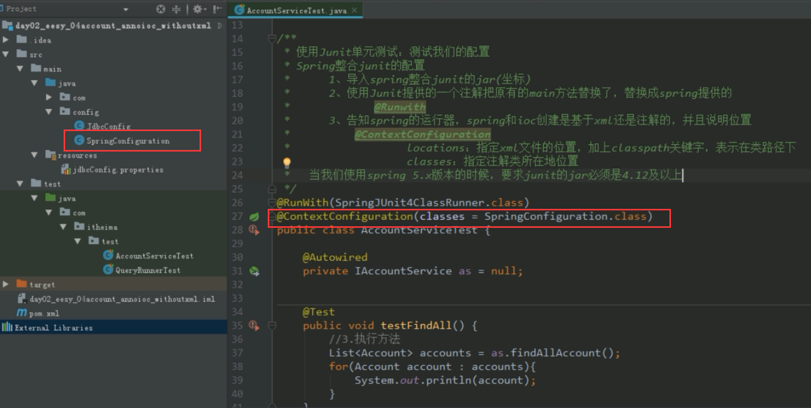 - 使用Junit提供的一个注解把原有的main方法替换了,替换成spring提供的。