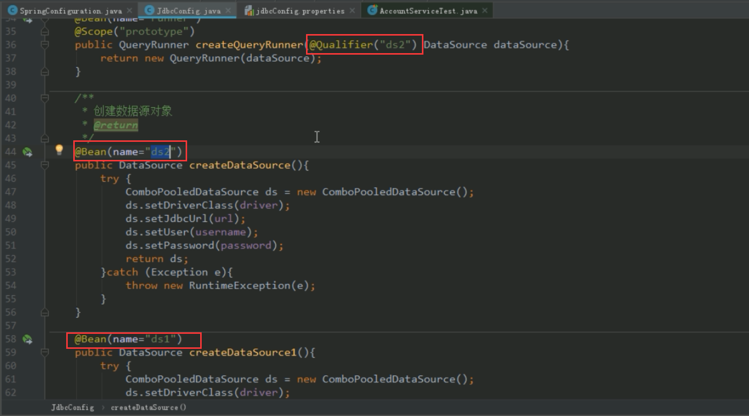 @Bean 作用:用于把当前方法的放回值作为bean对象存入Spring的ioc容器中。 属性: name:用于指定bean的id。当不写时,默认值是当前方法的名称 细节: 当我们使用注解配置方法时,如果方法有参数,Spring框架会去容器中查找有没有可用的bean对象。 查找的方式和Autowired注解的作用是一样的。