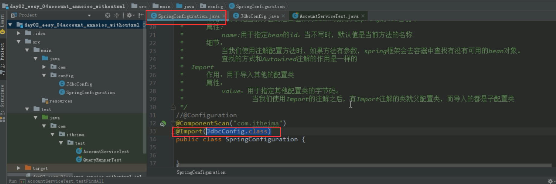 @Import 作用:用于导入其他的配置类 属性: value:用于指定其他配置类的字节码。 当我们使用Import注解之后,有Import注解的类就是父配置类,导入的都是子配置类。- 使用案例: