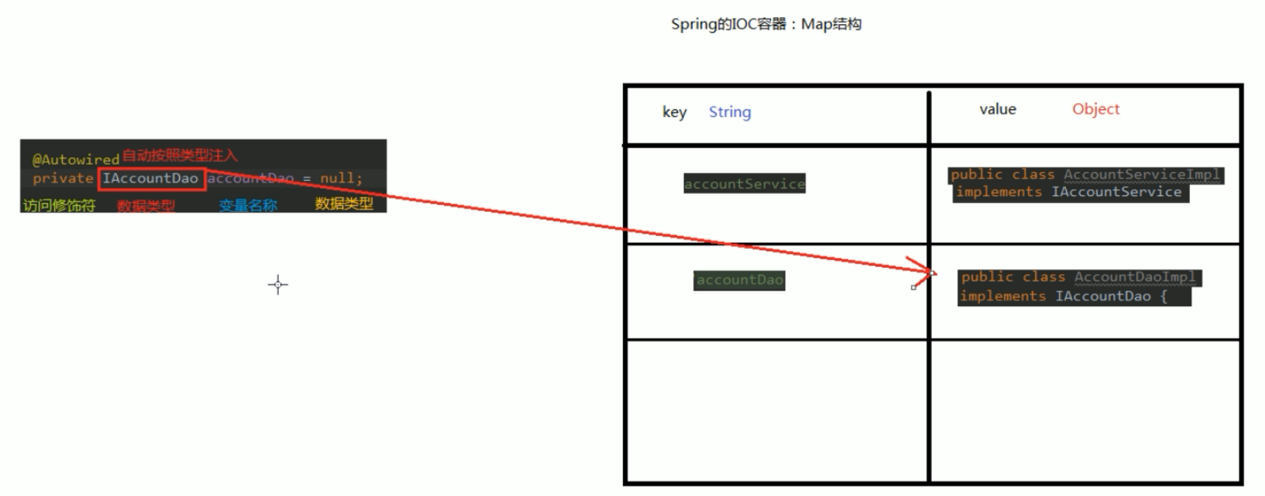 @Autowired: 作用:自动按照类型注入。 * 只要容器中有唯一的一个bean对象类型和要注入的变量类型 匹配,就可以注入成功。 * 如果ioc容器中没有任何bean的类型和要注入的变量类型匹 配,则报错。 * 如果ioc容器中有多个类型匹配时:首先按照类型圈定出来匹 配出来的对象,然后使用变量名称作为bean的id,在圈定的里 面在找那个一样。 * 问题:所以匹配多个的时候找不到一样的就没法注入,所 以要==用到@Qualifier注解== 出现位置: 可以是变量上,也可以是方法上 细节: 在使用注解注入时,set方法就不是必须的了 * 举例: @Autowired private IAccountDao accountDao = null; ============================== @Qualifier注解 作用:在按照类中注入的基础之上再按照名称注入。它在给类成员注入 时不能单独使用(需要在上面写@Autowired)。但是在给方法参数注入时可以(稍后我们讲) 属性: value:用于指定注入bean的id。 =============================== @Resource注解 作用:直接按照bean的id注入。它可以单独使用。 属性: name:用于指定注入bean的id。 =***=以上三个注入都只能注入其他bean类型的数据,而基本类型和String类 型无法使用上述注解实现。== =***=另外,集合类型的注入只能通过XML来实现== ================================ @Value注解 作用:用于注入基本类型和String类型的数据 属性: value:用于指定数据的值。它可以使用Spring中SpEL(也就是Spring的el表达式) SpEL的写法:${表达式}- 怎么注入成功及Spring的IOC是一个什么结构?(此时只有一个类型匹配)