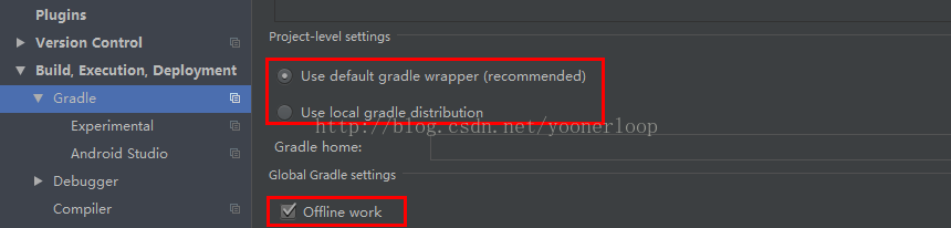 设置Studio,File->setting->gradle,勾选offline work,另外还可以选择性的使用默认的gralde,勾选user local gradle distribution选项,配置默认的gradle home路径。