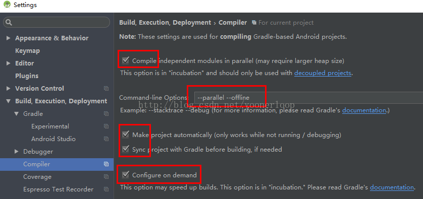 设置Studio,File->setting->compiler,选中并且配置参数,如下图: