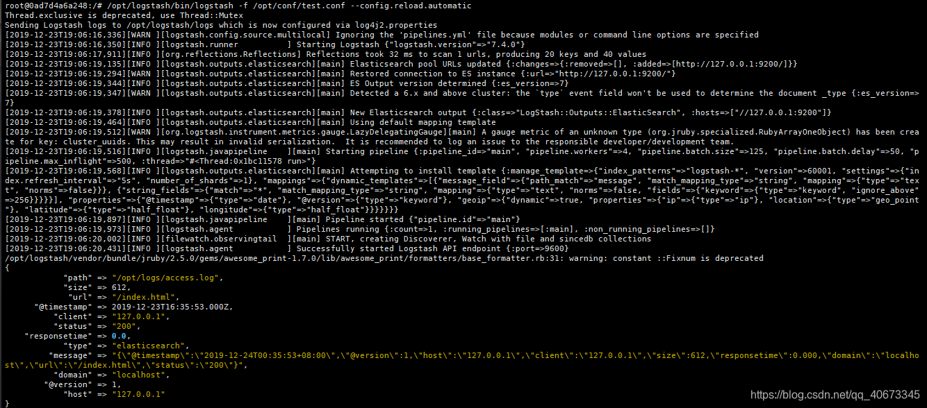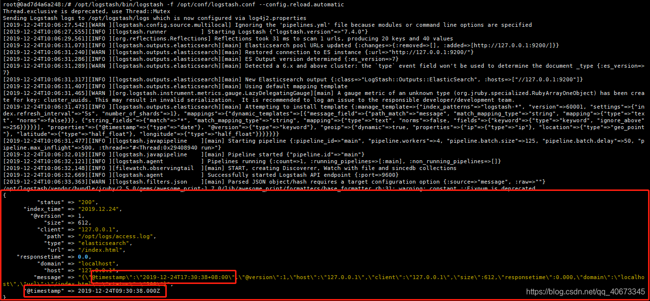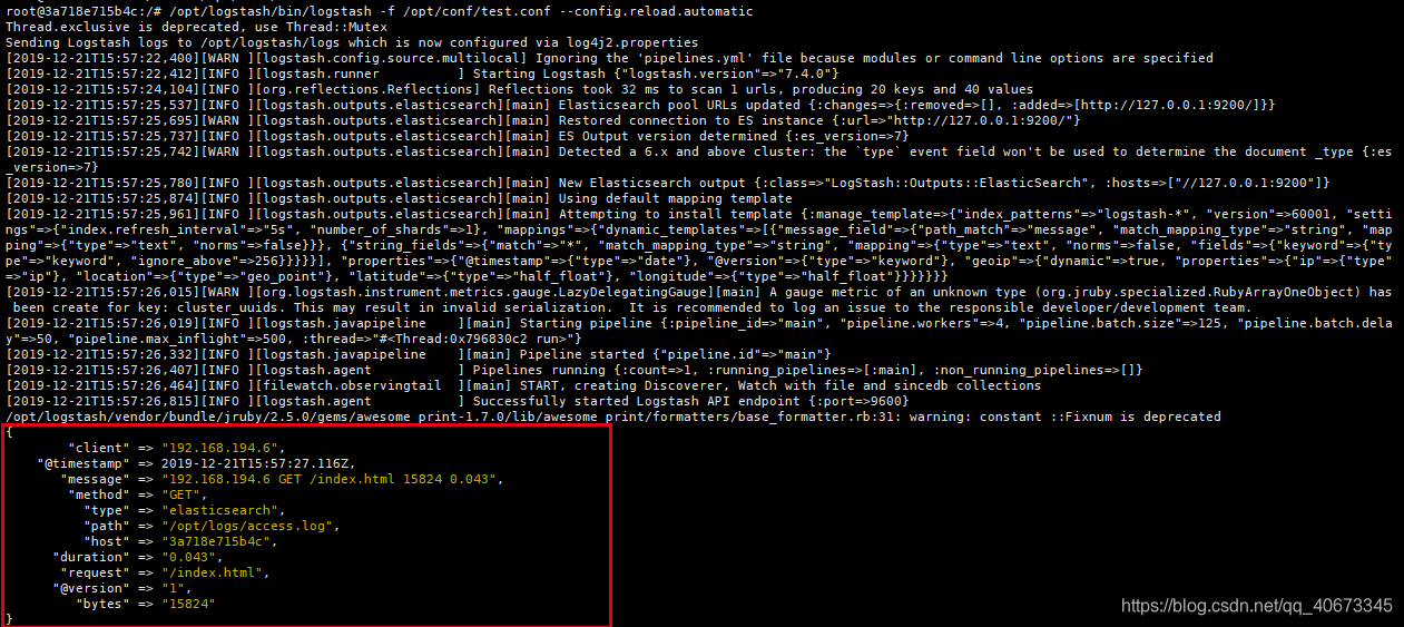 运行logstash,终端打印出日志内容: