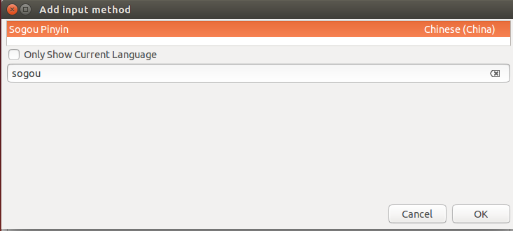 去掉上图中“Only Show Current Language”前面的勾,然后在“Search Input Method”编辑框中输入sougou,即可在上面的输入法列表中显示搜狗拼音,如下图: