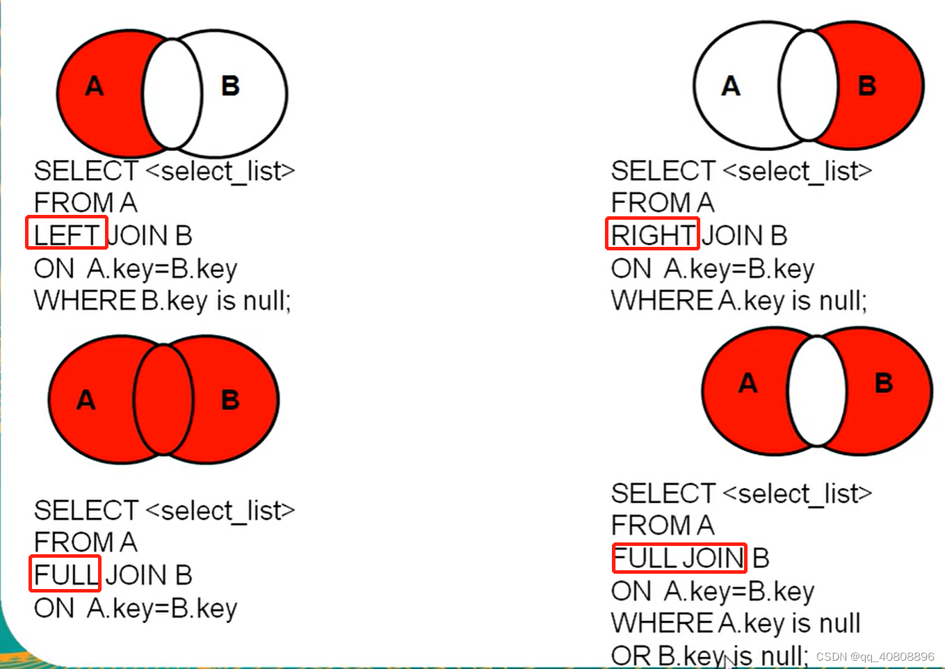 内连接,inner;外连接 左外left【outer】右外right【outer】全外 full 【outer】,outer可以省略;交叉连接cross