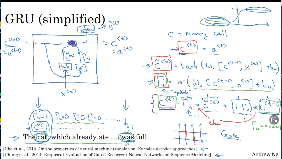 Γ u \Gamma_{u} Γu等于0时, 等于 c ⟨ t − 1 ) c^{\langle t-1)} c⟨t−1),即不要更新值,使用旧值