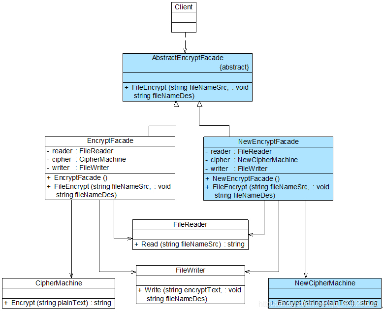 在标准的外观模式结构图中,如果需要增加,删除或更换与外观类交互的子系统类,必须修改外观类或客户端的源代码,这将违背开闭原则,因此可以通过引入抽象外观类对系统进行改进,这在一定程度上可以解决该问题.