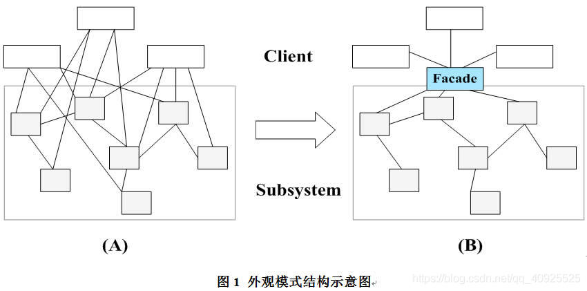 外观模式引入一个新的外观类,它为多个业务类的调用提供了一个统一的入口,简化了类与类之间的交互.在外观模式中,那些需要交互的业务类被称为子系统.