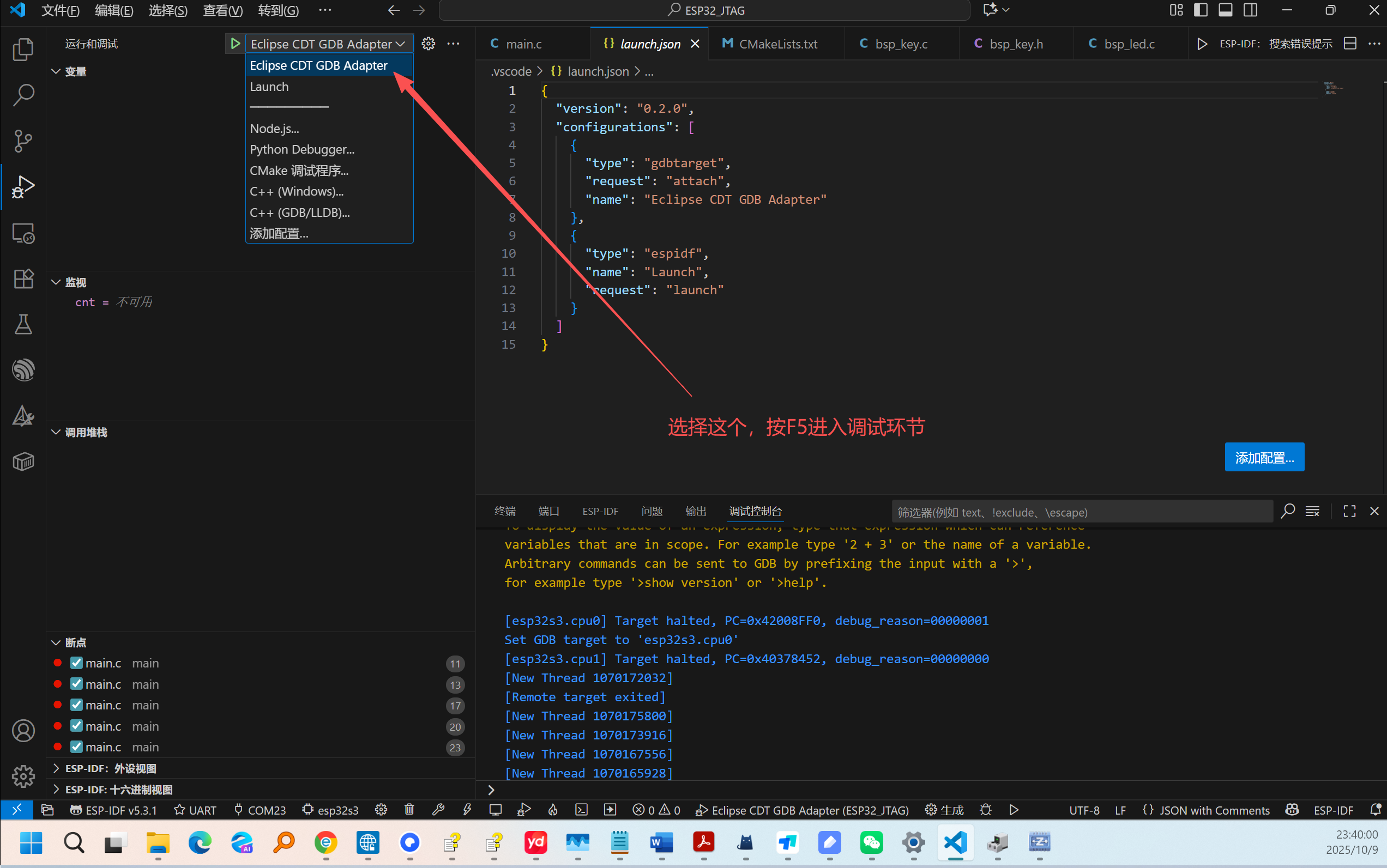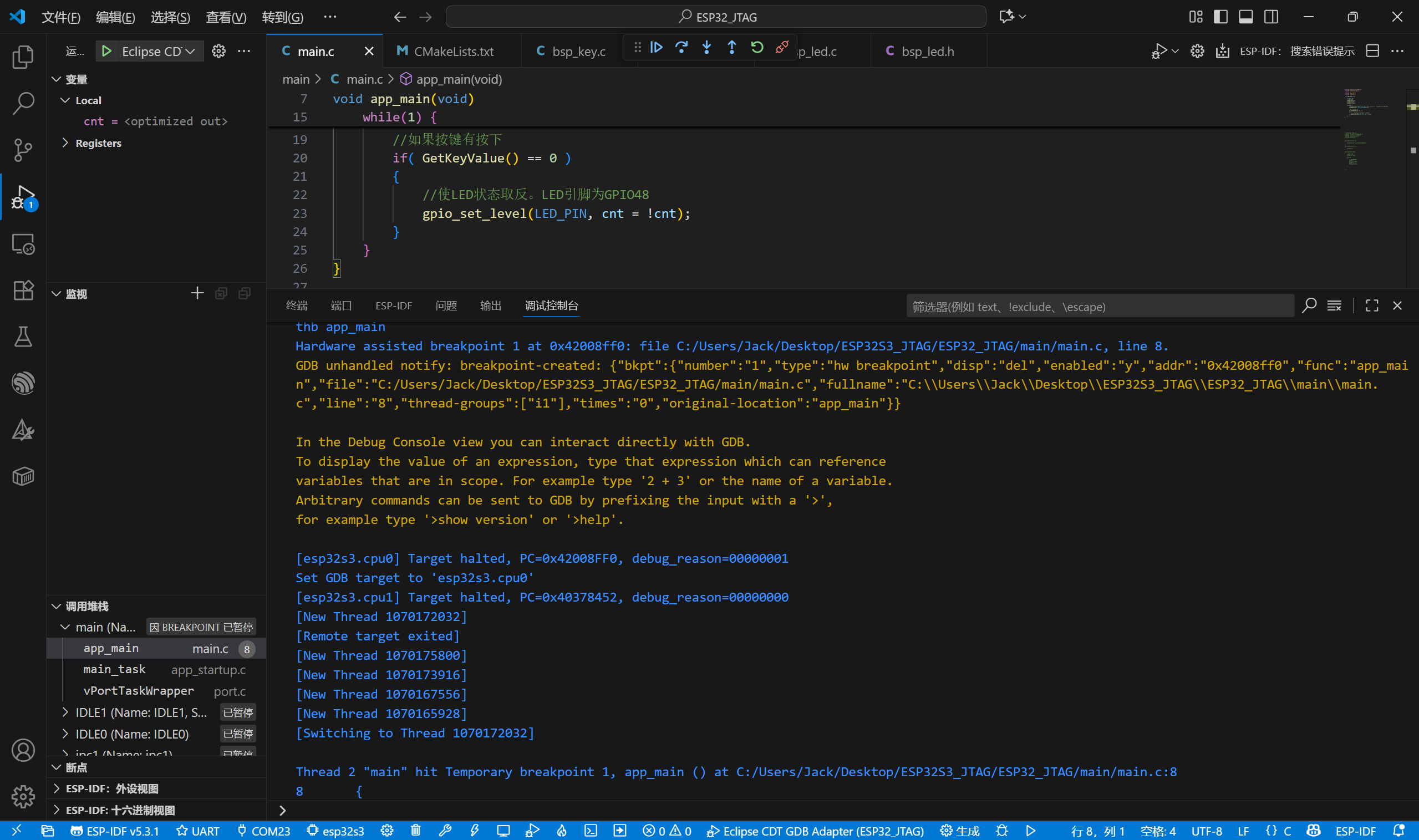 VScode需要选中SDK配套开发板的FLASH(开发板芯片我自行换了16M的)、PSRAM(8M)、系统时钟100改为1000;系统CPU频率选择240mHZ;烧录方式选择串口,并且选中对应的串口号,调试之前需要先下载进去在按F5才能进行调试;其他都是工程默认,没有修改过其他东西,也没有修改过launch,json;之所以强调这点,我是看到很多人都说修改这个,把我搞得一塌糊涂,可能是我学艺不精吧,属实没整明白配置那么多那些做什么~