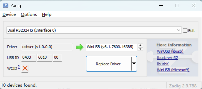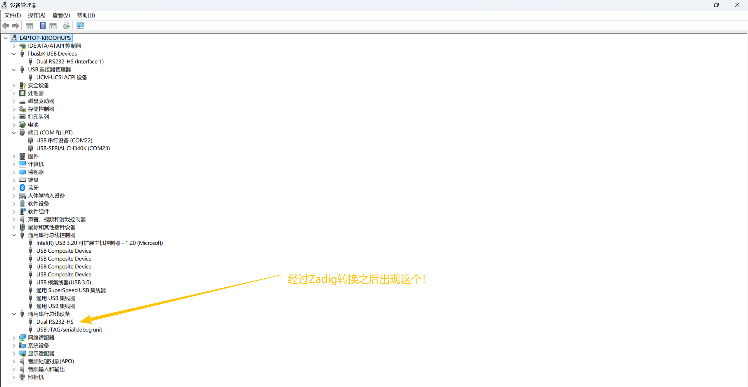 ESP-Prog上的芯片采用的是FT2232HL,用户只需在电脑上安装FT2232HL驱动程序即可使用。电脑会识别出两个端口,端口序号大的是Program接口,序号小的是JTAG接口,这里将Dual RS232 HS (Interface 0) 转换为WinUSB即可,另外一个接口1不用管它(也许是直接接串口,这样就不用额外一根转串口数据线,一根线解决【本人猜测】);下图是使用Zadig驱动软件将识别到的Dual RS232 HS (Interface 0)转换为WinUSB,不转换VSCODE是用不了的!