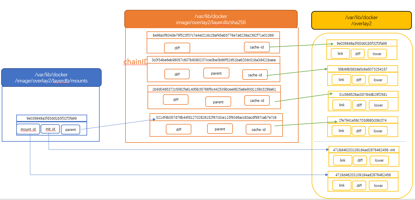 init-id:initID是在mountID后加了一个-init,同时initID就是存储在/var/lib/docker/overlay2/的目录名称。
