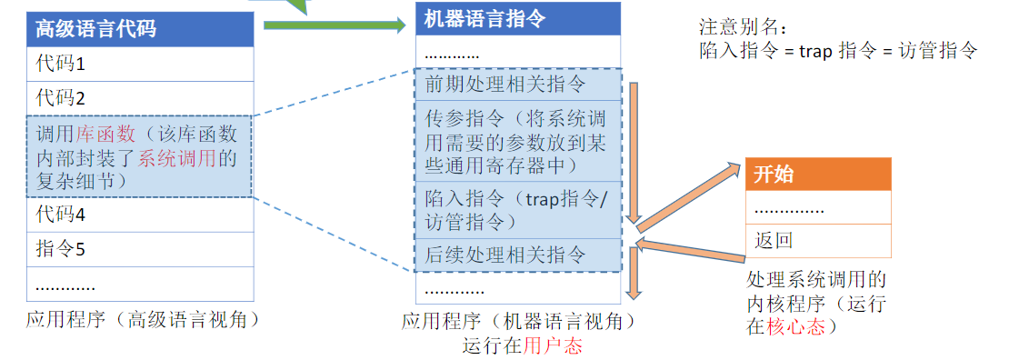 | 普通应用程序 | 可直接进行系统调用,也可使用库函数。有的库函数涉及系统调用,有的不涉及 |