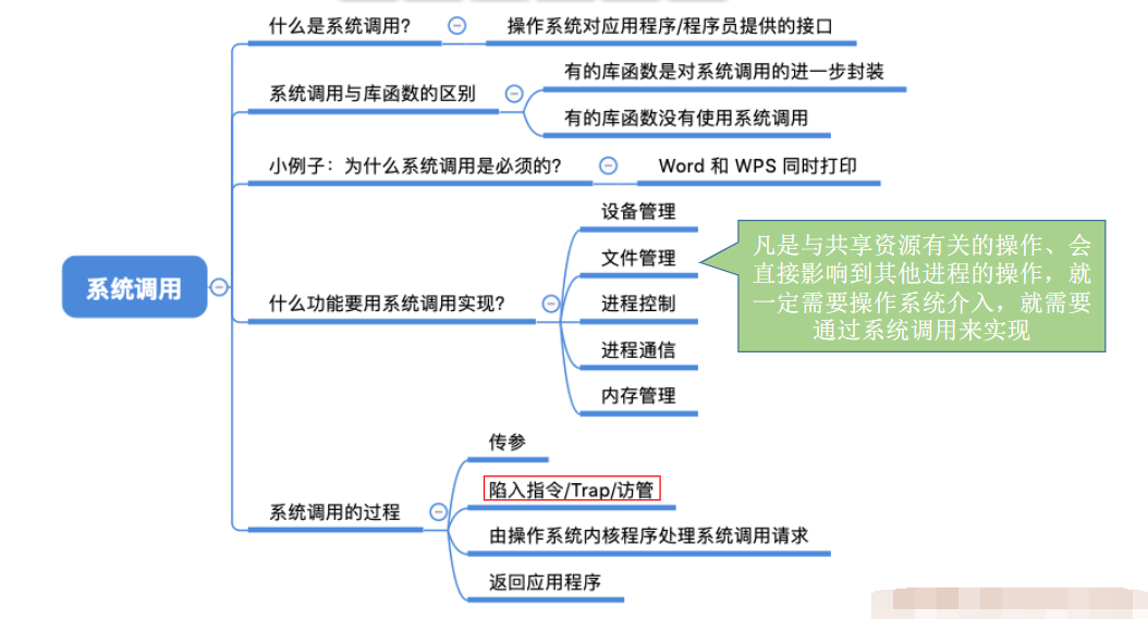 应用程序通过系统调用请求操作系统的服务。而系统中的各种共享资源都由操作系统内核统一掌管,因此凡是与共享资源有关的操作(如存储分配、I/O操作、文件管理等),都必须通过系统调用的方式向操作系统内核提出服务请求,由操作系统内核代为完成。这样可以保证系统的稳定性和安全性,防止用户进行非法操作。