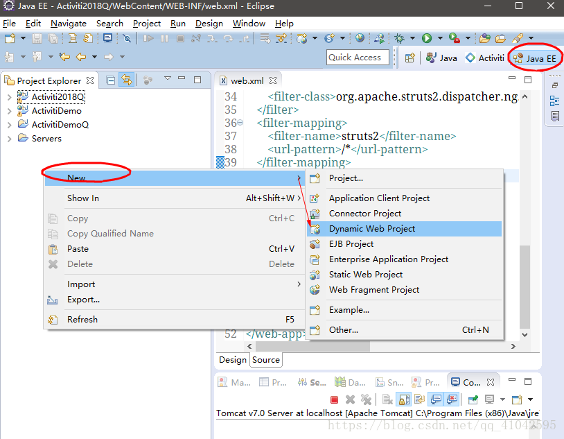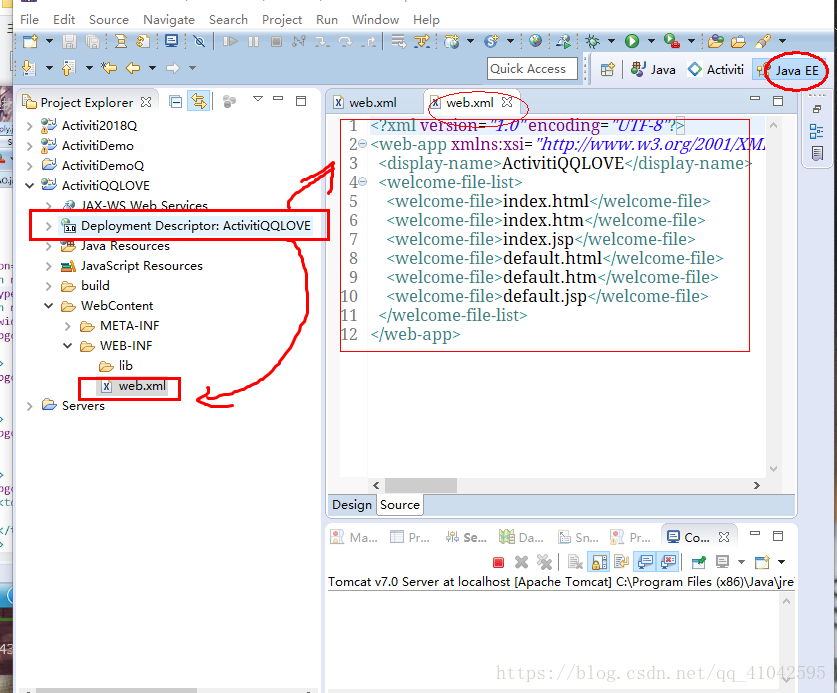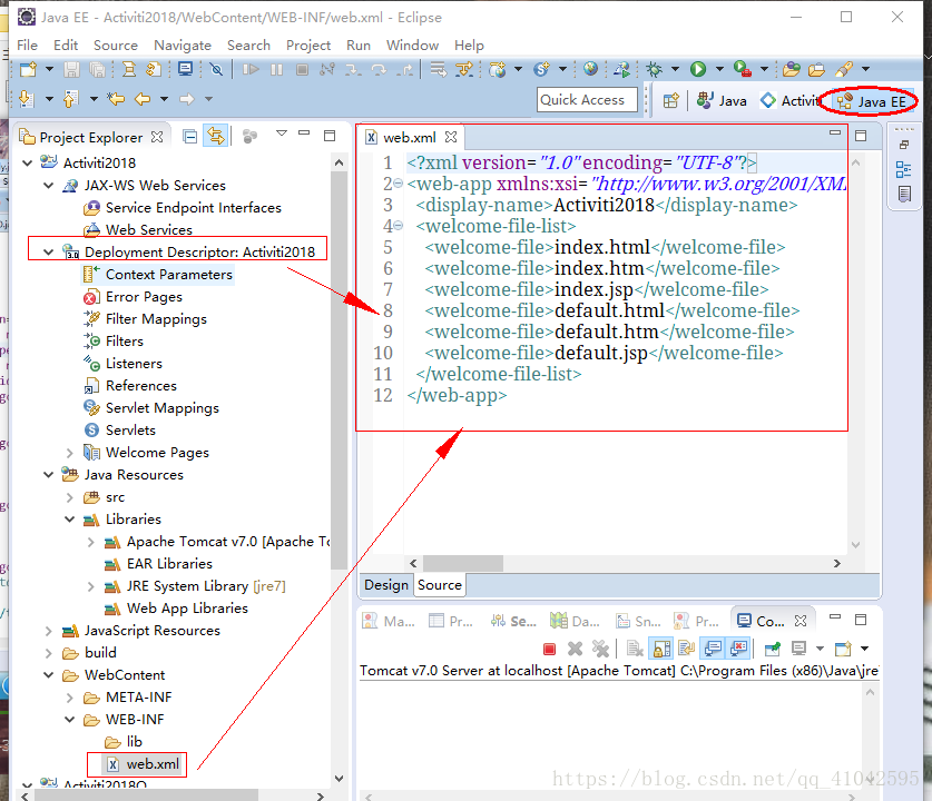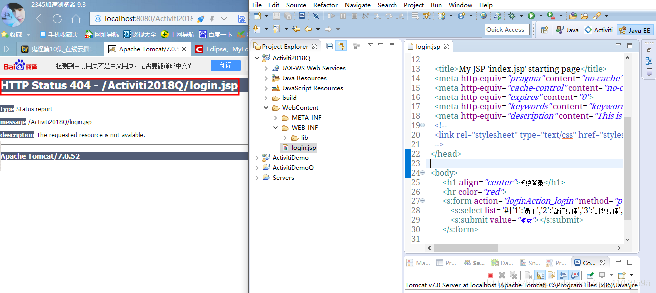 言归正传,想运行jsp,马虎的我直接在地址栏输"localhost:8080/Activiti2018Q/"或"localhost:8080/Activiti2018Q/login.jsp",浏览器却显示404,后台也报错,是关于web.xml的,