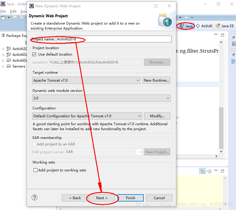 接着在弹出窗口输入Web Project的名--->Next--->Next( 注:其他都不需要改变,使用默认的即可, 该弹出窗口可以缩放大小,这个不说也知道吧!!!! (灬°ω°灬) <(▰˘◡˘▰)> )