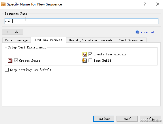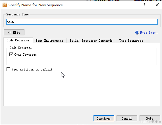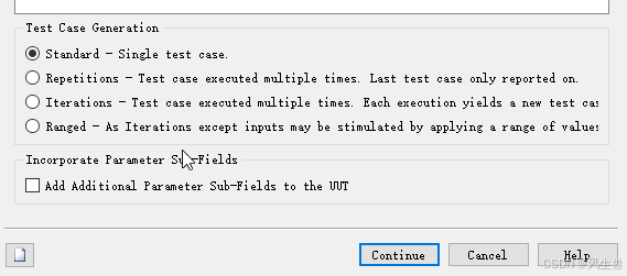 Build_Execution Commands和Test Scenarios默认配置即可,点击Continue即完成Sequence创建;在Sequence中选中需要进行测试的函数,选中函数,然后右键点击,选择Create New Test Case,可按照个人要求选择用例生成方式,默认Standard方式生成用例;