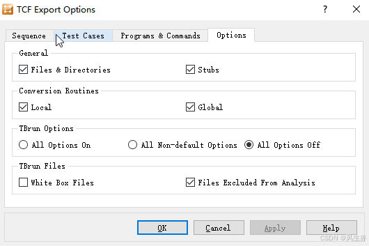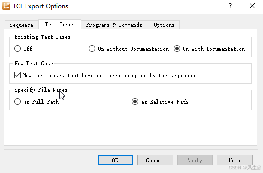 对于低层测试用例进行保存格式为输出tcf文件,选择config->Export Test Case(TCF) Mask,其中Sequence标签页全部选择,Programs & Commands标签页全不选,其他两个标签页如下如所示: