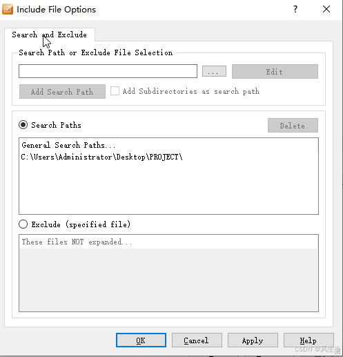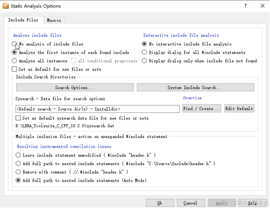 对头文件添加点击Search Options...,点击Edit选择头文件所在文件夹,点击Add Search Path,点击Apply,然后返回至Static Analysis Options界面,点击Edit Default可查看添加头文件地址;