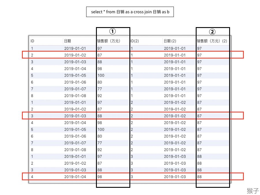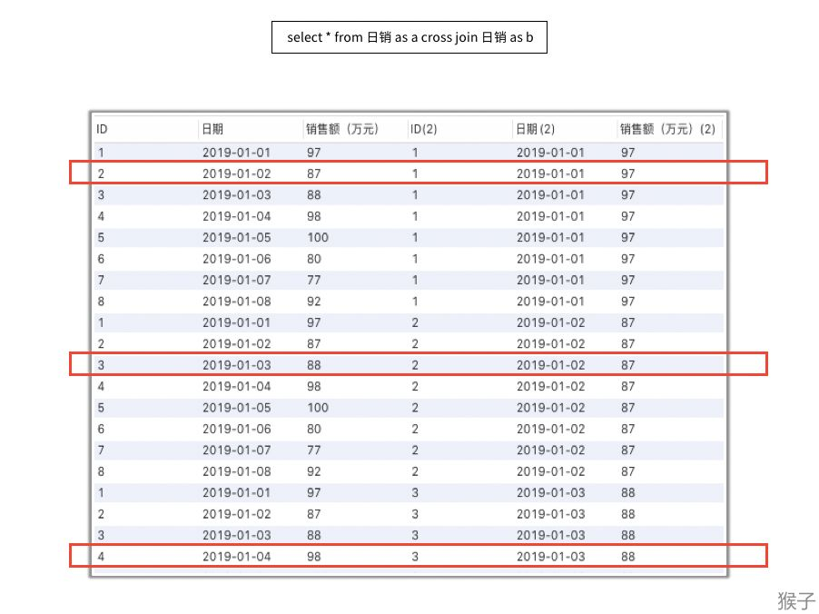 select *from 日销 as a cross join 日销 as bon datediff(a.日期, b.日期) = 1;