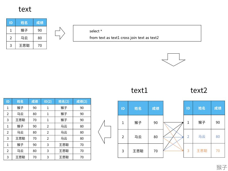 使用交叉联结会将两个表中所有的数据两两组合。如下图,是对表“text”自身进行交叉联结的结果: