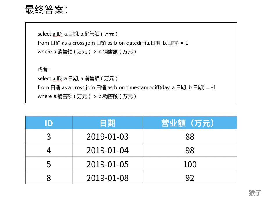 select a.ID, a.日期, a.销售额(万元)from 日销 as a cross join 日销 as bon datediff(a.日期, b.日期) = 1where a.销售额(万元) > b.销售额(万元);