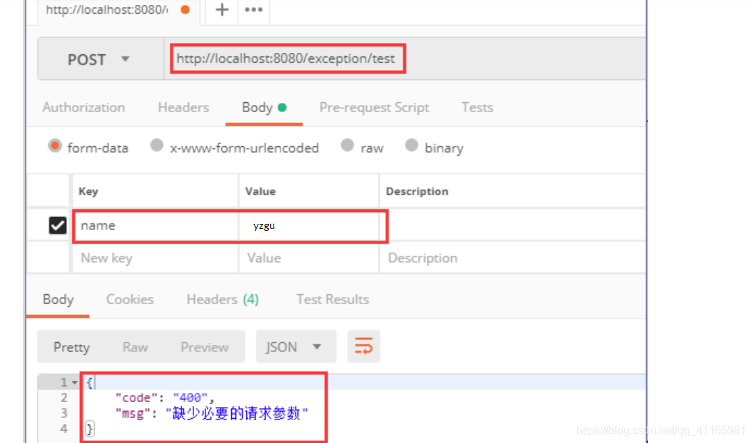 然后使用 Postman 来调用一下该接口,调用的时候,只传姓名,不传密码,就会抛缺少参数异常,该 异常被捕获之后,就会进入我们写好的逻辑,给调用方返回一个友好信息,如下: