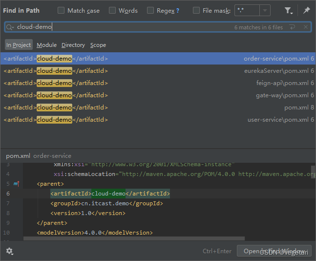 ctrl + shift + F 全局搜索老项目名称,将老项目名称改为新项目名称