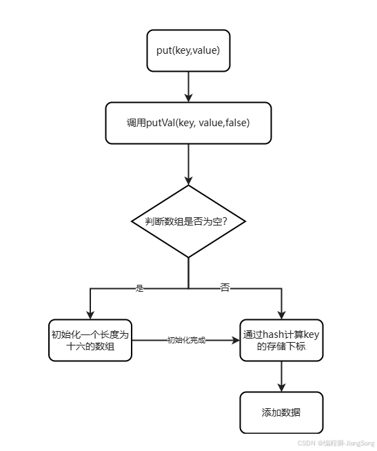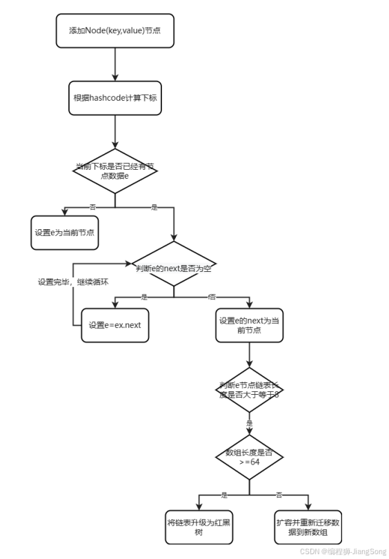 上面的流程都轻轻松松,接下来将进入本章的一个重难点,就是添加数据到链表以及链表升级为红黑树的流程。老规矩,为了方便大家的理解,我这里针对添加数据的部分画出一张简单的流程图如下图2.3-1 添加数据流程示意图所示。