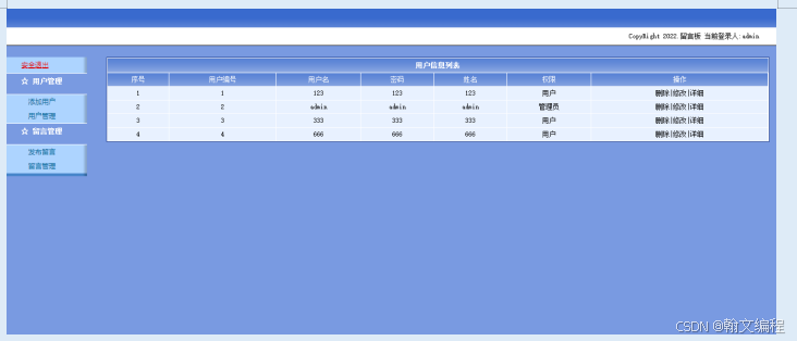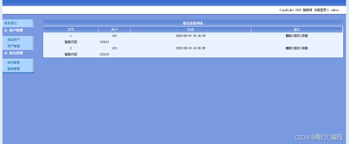 留言管理模块包括对系统内留言信息的发布,修改,查看,删除等功能。