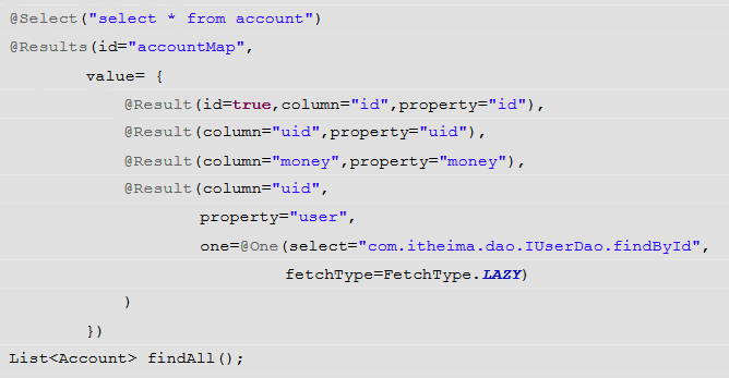 如上是一对多情况下的注解的使用,其中的那个fetchType属于是配置延迟加载的情况