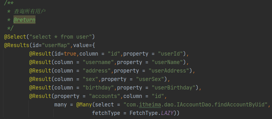 如上是一对一的封装模式:主要使用到@Results,@one,@Result三个注解,注意书写的格式