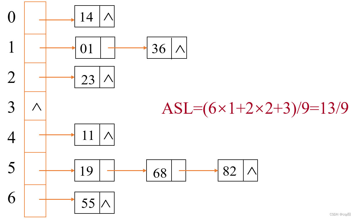 将所有哈希地址相同的记录都链接在同一链表中。例:同前例的关键字,哈希函数为 H(key)=key MOD 7