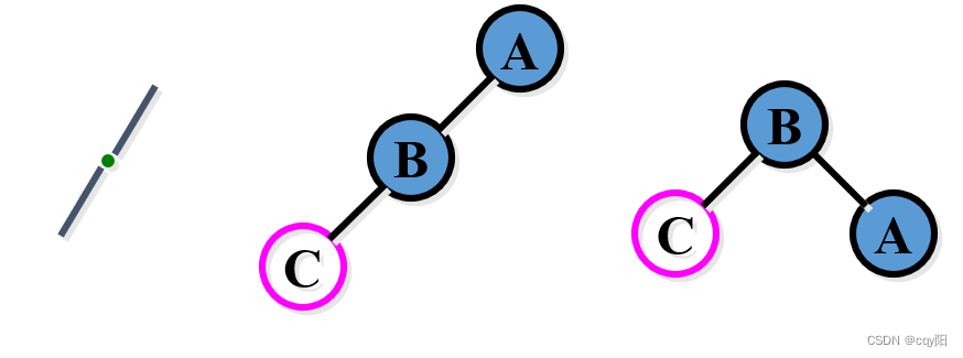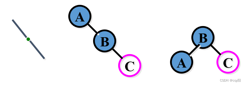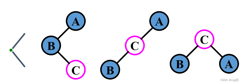 若在A的左子树的右子树上插入结点,使A的平衡因子从1增加至2,需要先进行逆时针旋转,再顺时针旋转。(以插入的结点C为旋转轴)