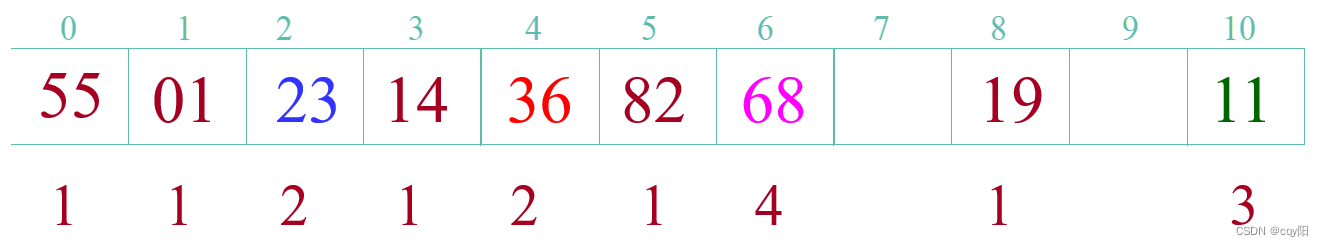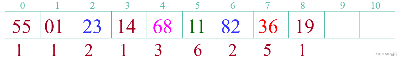 例:关键字集合 { 19, 01, 23, 14, 55, 68, 11, 82, 36 },设定哈希函数 H(key) = key MOD 11 ( 表长=11 )。
