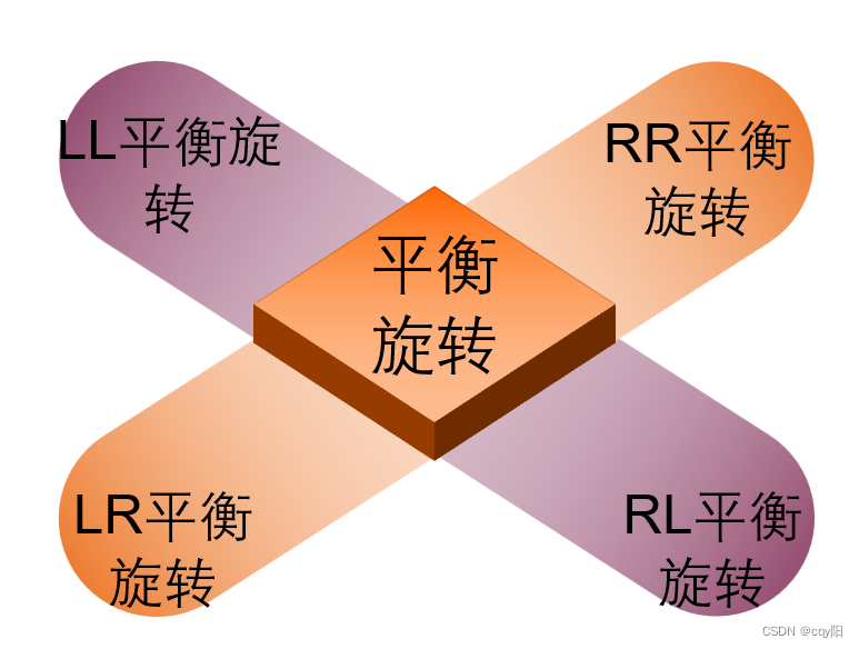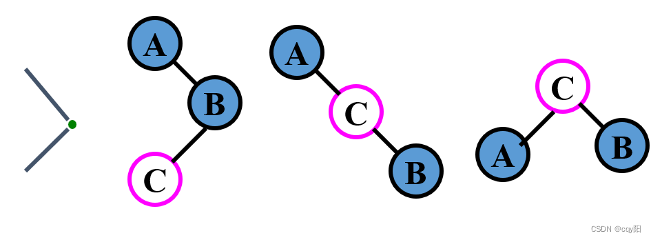 若在A的右子树的左子树上插入结点,使A的平衡因子从-1增加至-2,需要先进行顺时针旋转,再逆时针旋转。(以插入的结点C为旋转轴)