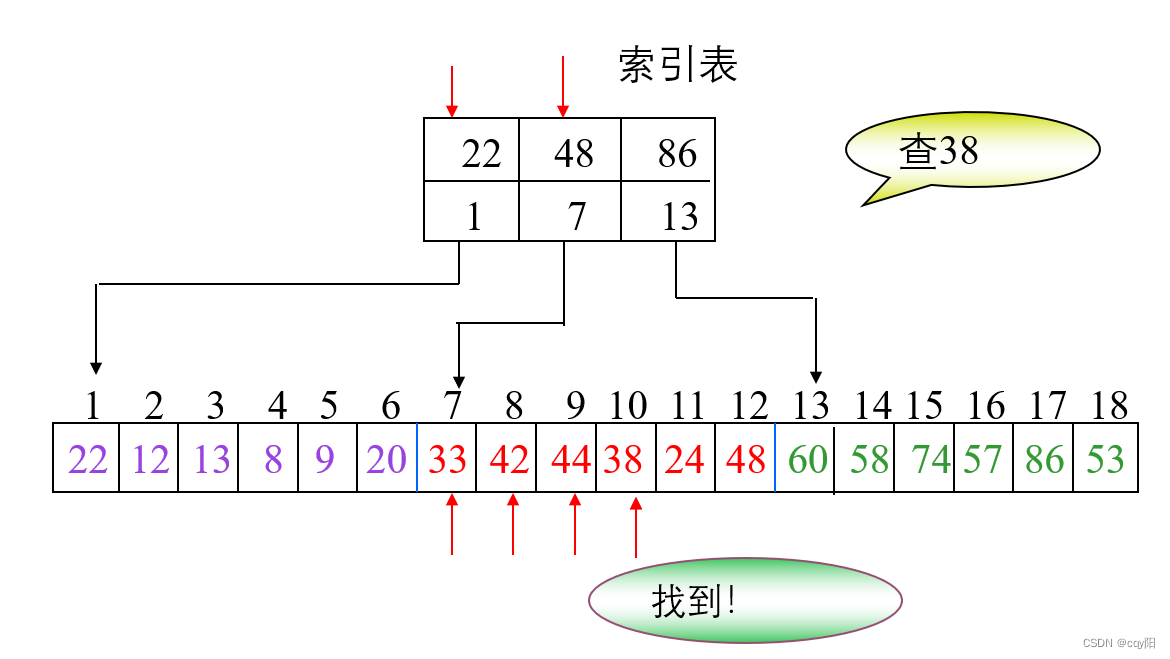1、用给定值k在索引表中检测索引项,以确定所要进行的查找在查找表中的查找分块 (由于索引项按关键字字段有序,可用顺序查找或折半查找) ;