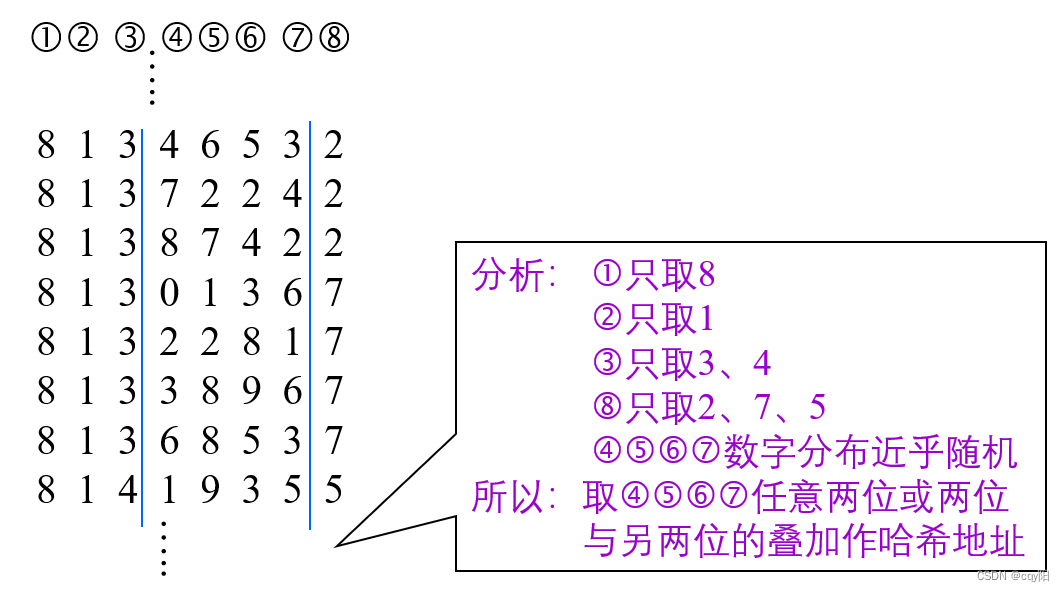 如果关键字是位数较多的数字(比如手机号),且这些数字部分存在相同规律,则可以采用抽取剩余不同规律部分作为散列地址。